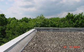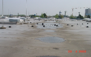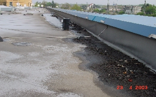 Die Dachfläche ist unterteilt in Hoch- und Tiefpunkte und weist ein ausreichendes Gefälle von 2-3 % auf. In den Kehlen sind in unregelmässigen Abständen Dacheinläufe. Nahezu im gesamten Kehlbereich steht grossflächig Wasser. Die grössten Pfützen haben eine Länge von bis zu 15 m und Breiten bis zu 6 m. In den Pfützen sind starke Schmutz- und Schlammablagerungen, die zum Teil die Einläufe bzw. Einlaufsiebe verstopfen.